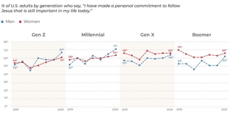 "This data represents good news for church leaders and adds to the picture that spiritual renewal is shaping Gen Z and Millennials today," said Daniel Copeland, Barna Group's vice president of research.